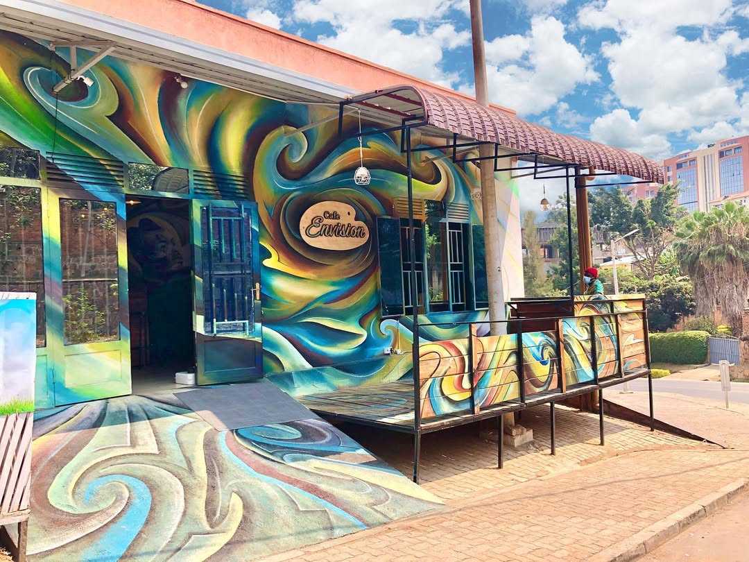 Cafe Envision is an arts cafe and kitchen serving your favorite foods, fresh juices, coffee, beer, and wine in our exquisitely decorated space. Come see the famous panoramic mural painted by local artists from the arts collective and enjoy affordable prices in the convenient location off the main road in Gishushu